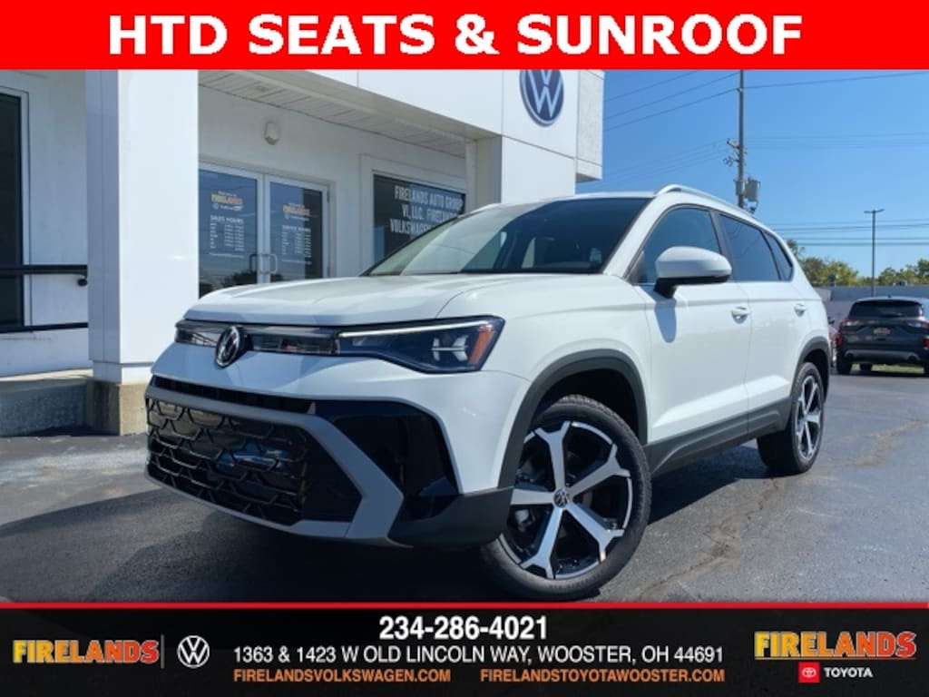 Pure White 2025 Volkswagen Taos 1.5T SEL HTD SEATS & SUNROOF AWD 8-Speed Automatic with Tiptronic 1.5L I4 Turbocharged DOHC 16V LEV3-SULEV30 174hp 4WD/4X4/AWD, Leather Seats, Heated Seats, Heated Steering Wheel, Sunroof/Moonroof, Panoramic Roof, Remote Start, Navigation System, CarPlay, Android Auto, Bluetooth, Backup Camera, Rain Sensing Wipers, Blind Spot Monitoring, Adaptive Cruise Control, Lane Departure Warning, Parking Sensors, Brake Assist, Steering Wheel Controls, Cruise Control, Keyless Start, Keyless Entry, Premium/Alloy Wheels, 4D Sport Utility, AWD, Active Blind Spot Monitor, AM/FM radio: SiriusXM with 360L, Automatic temperature control, Brake assist, Emergency communication system: VW Car-Net Safe & Secure 5-year, Exterior Parking Camera Rear, Front Bucket Seats, Front dual zone A/C, Front Strut Rear Multi-Link Suspension, Fully automatic headlights, Heated & Actively Ventilated Front Bucket Seats, Heated front seats, Heated steering wheel, Illuminated entry, Leather Shift Knob, Navigation system: VW Car-Net Guide & Inform, Perforated Vienna Leather Seating Surfaces, Power driver seat, Power moonroof, Radio data system, Radio: MIB3 Discover Media AM/FM/HD, Rain sensing wipers, Remote keyless entry, Speed control, Spoiler, Steering wheel mounted audio controls, Traction control, Ventilated front seats, Wheels: 19" 2-Tone Machined Alloy.